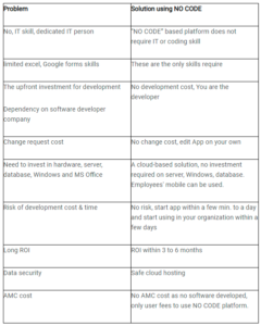 NO CODE platform allows user to create their own web, Android, or iOS application without any IT skill or coding. These platforms do not require any database and server as it’s a mostly cloud-based solution, so even that skill of database configuration or cost is not at all required.
